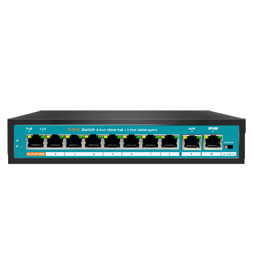 - 8 puertos RJ45 10/100 Mbps + 2 Uplink Gigabit